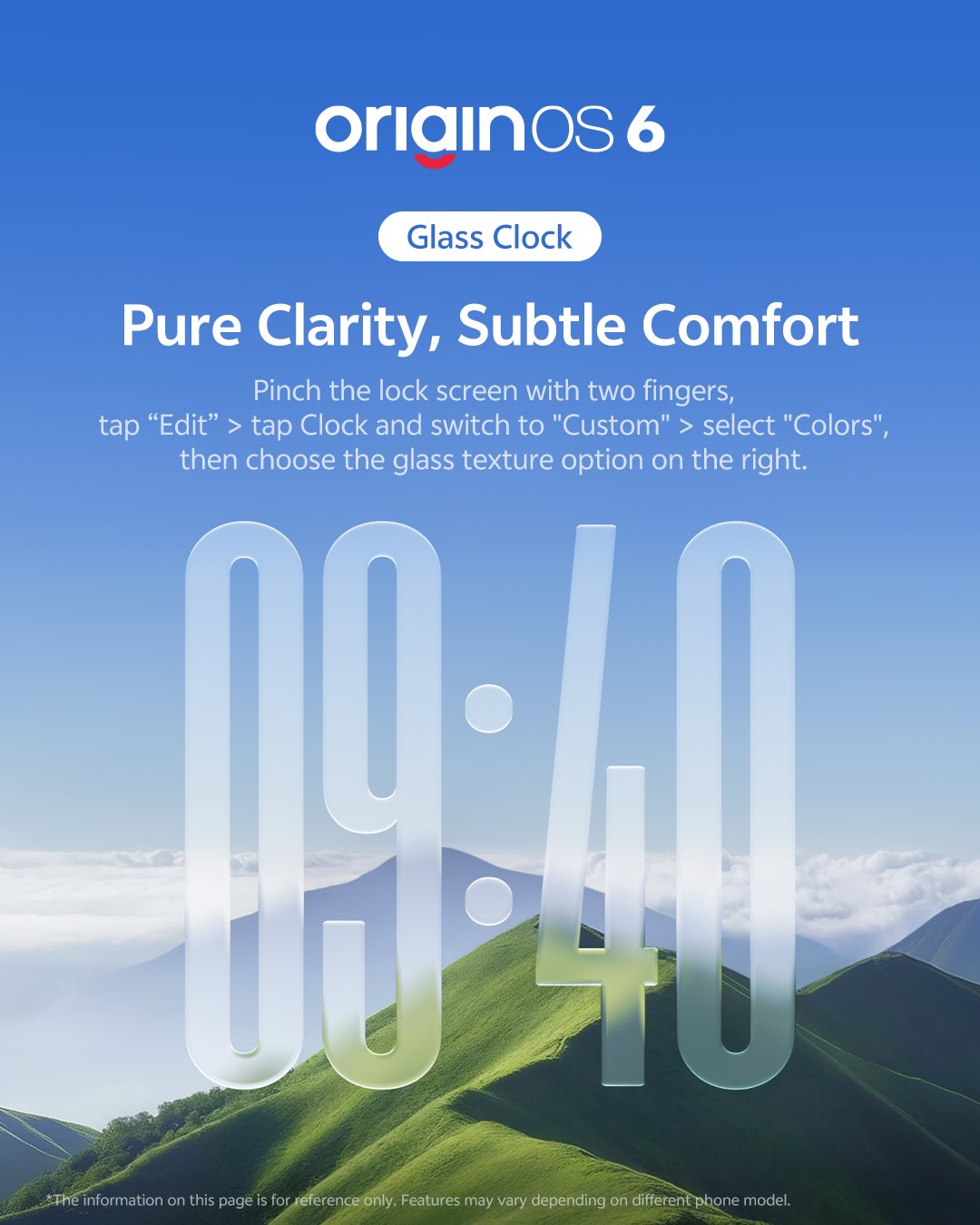 See time differently. The OriginOS 6 Glass Clock brings crystal clarity and gentle warmth together. A minimalist design that seems to float effortlessly on your lock screen.